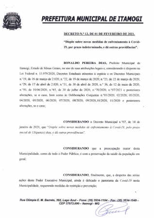DECRETO 013.2021 - DISPOE SOBRE NOVAS MEDIDAS DE ENFRENTAMENTO A COVID 19 POR PRAZO INDETERMINADO E DA OUTRAS PROVIDENCIAS