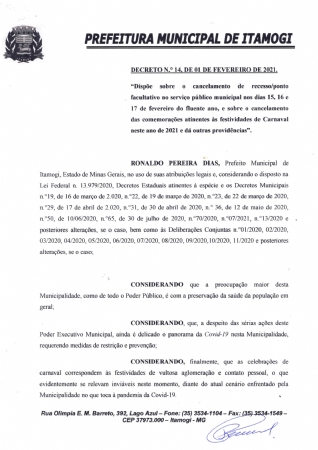 DECRETO 014.2021 - DISPOE SOBRE O CANCELAMENTO DE RECESSO PONTO FACULTATIVO NO SERVICO PUBLICO MUNICIPAL NOS DIAS 15 16 E 17 DE FEVEREIRO DO FLU